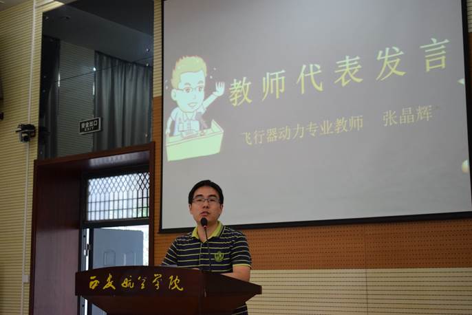 教师代表飞行器动力教研室副主任张晶辉老师分享了作为西航人的感谢和期盼。希望新同学们要善于主动学习、敢于责任担当、勤于扎实笃学,养成良好学风,树立坚毅品质,迎接大学挑战!