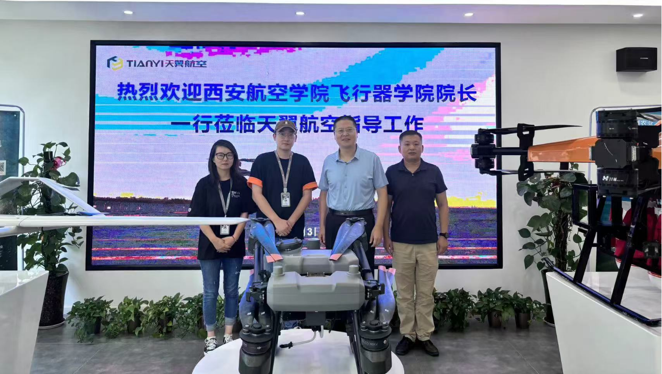 在交流前,天翼航空相关负责人带领大家共同参观了企业的无人机教育系列产品、固定翼无人机、四旋翼无人机等产品,以及无人机专业相关实验室建设方案等事项。
