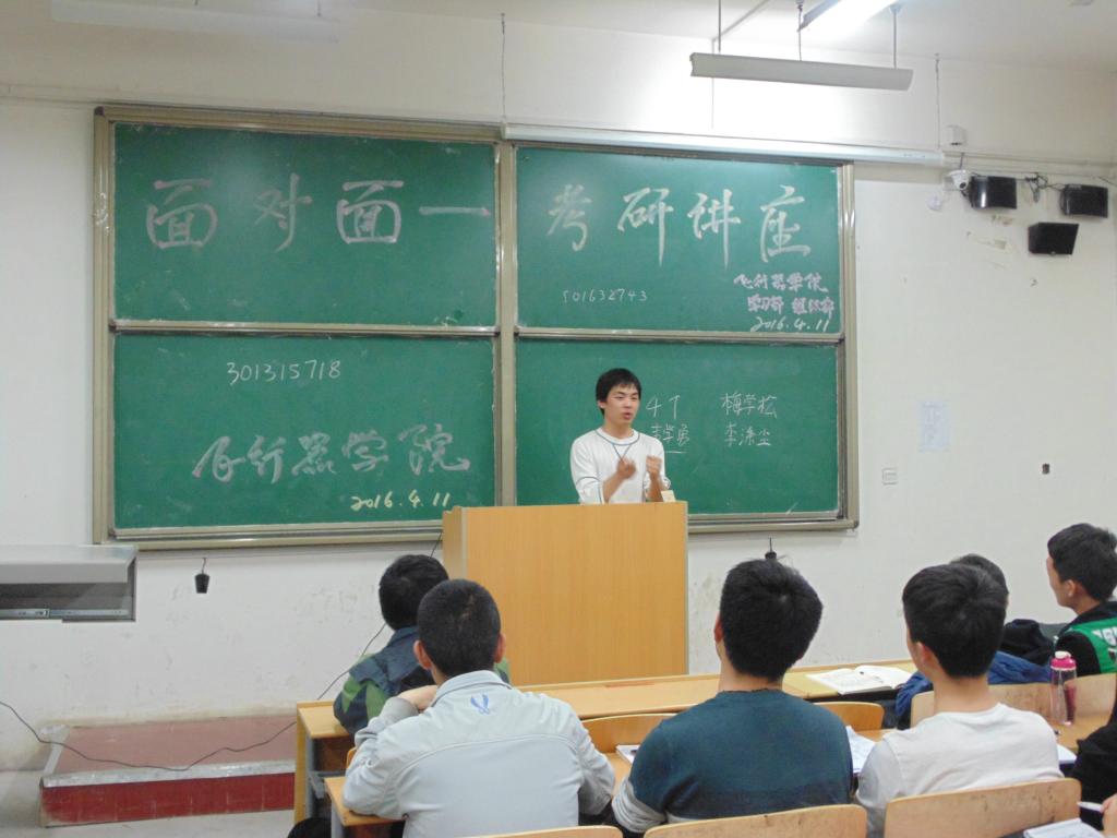 此次座谈会由两部分组成。第一部分,由四位考研成功的同学分别讲述他们四人的考研经历和亲身备考经验。分别从高数、英语、政治及专业课的复习方法着手,进行了详细的说明。并从考研专业公司的选择和与导师联系的技巧进行了指导说明,使大家对考研有了更深层次的了解与计划;第二部分,是学习经验交流与提问互动环节。同学们通过对学长们的提问,解决了自己初步遇到的疑惑与困难,对各自的考研方向有了更深入的了解与初步定位。